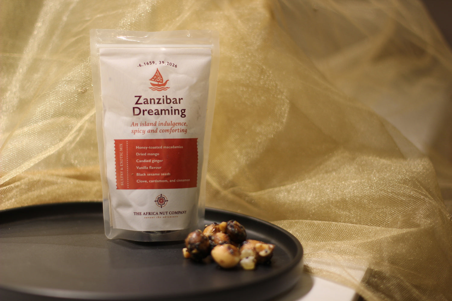 Relax on Zanzibar island. Inspired by centuries-old spice markets, our buttery macadamias are honey-toasted and coated with cloves, cardamom, and cinnamon. Sweet dried mango and candied ginger add a sweet chewy texture while a hint of vanilla and black sesame seeds bring subtle depth and earth textures. Savour the Adventure.