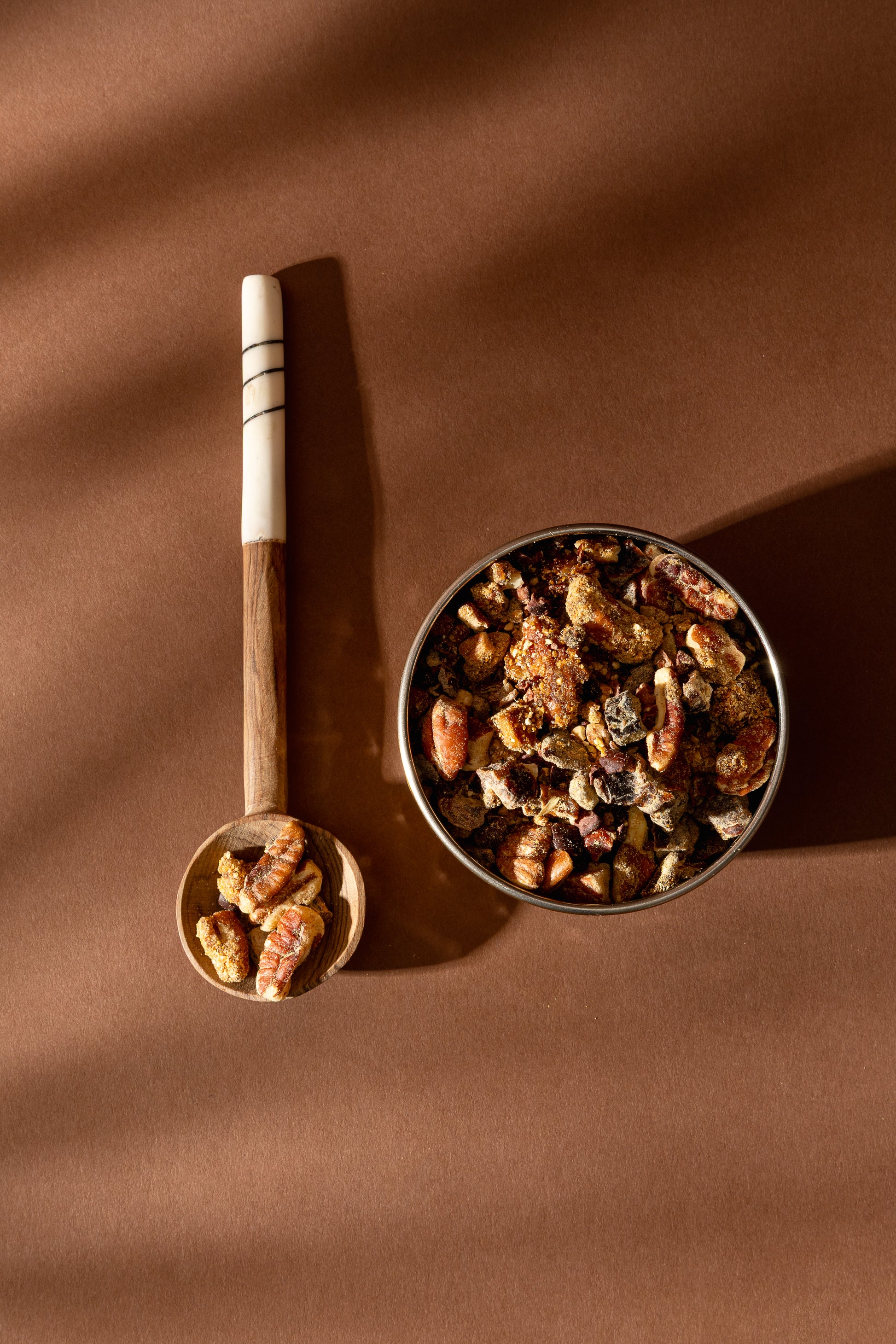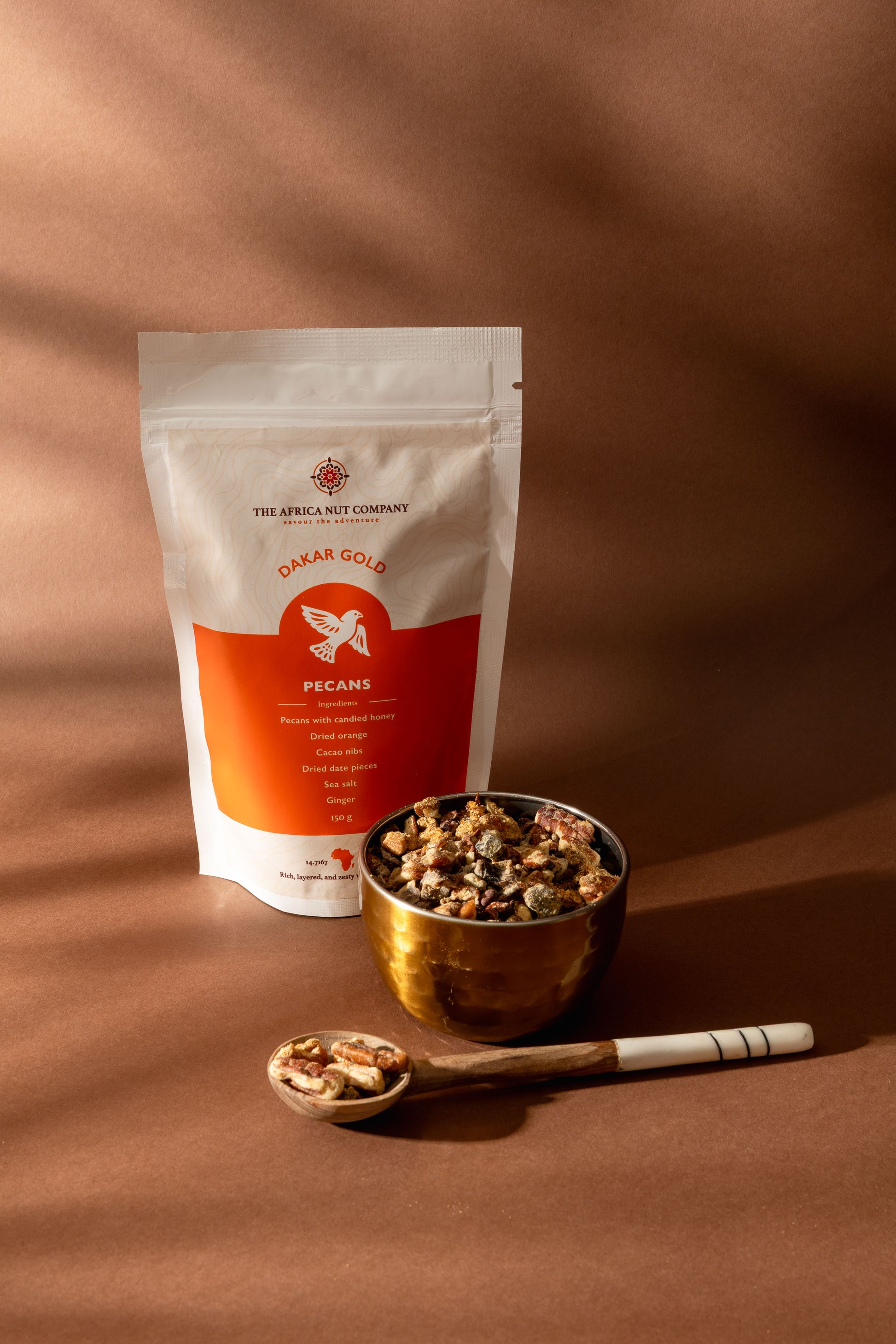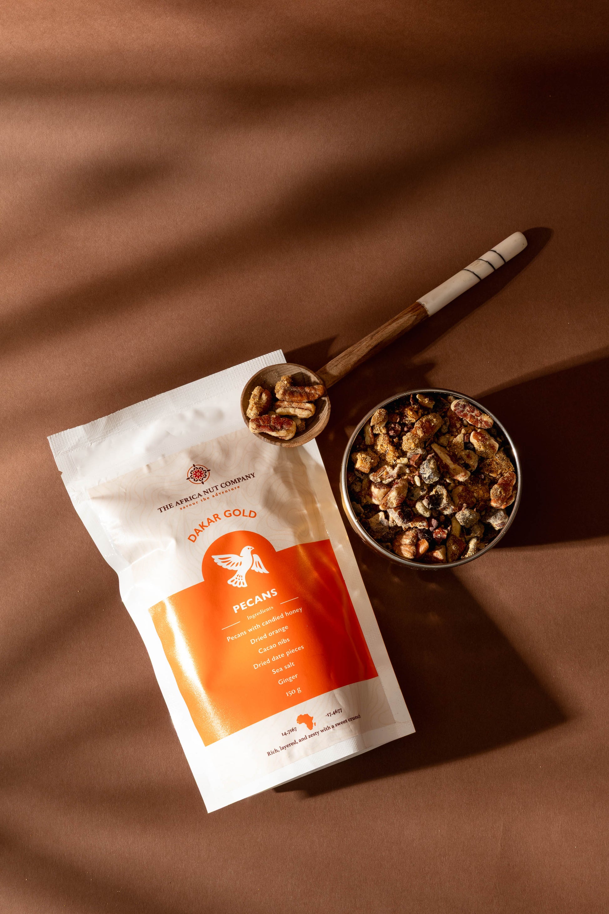 Discover the melting pot of Dakar. Inspired by centuries of regional exchange, our honey-candied pecans with sea salt and ginger provide a rich, crunchy base. Soft dried dates and cacao nibs pieces add a natural sweetness to complement the zesty sun-dried orange. Savour the Adventure.