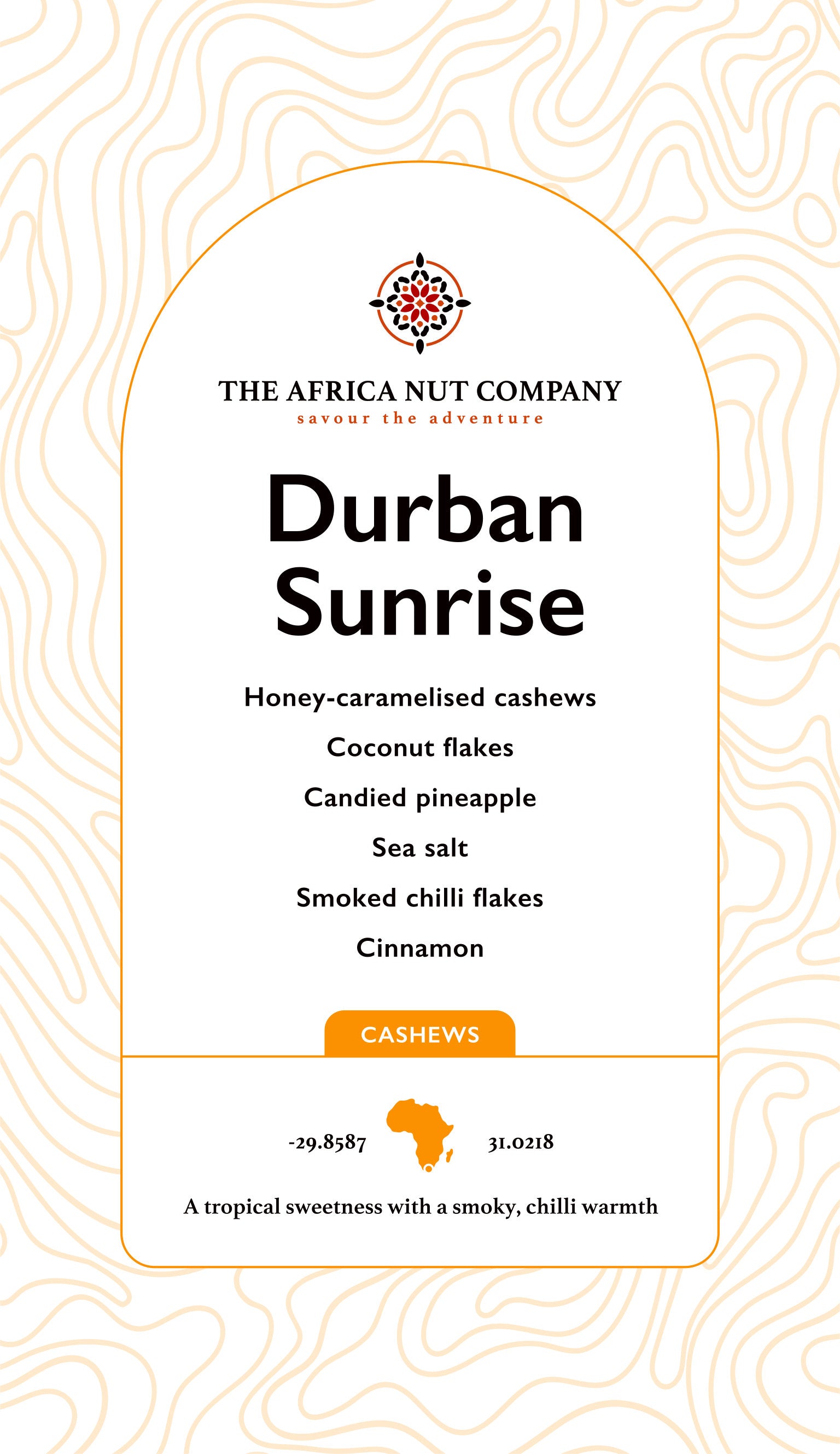 Escape to KwaZulu-Natal’s beaches. Inspired by classic chilli-pineapple carts, our premium cashews, lightly roasted and coated in honey, feature a smoky chilli spice combined with cinnamon that adds warmth. Sun-dried pineapple brings bright sweetness and toasted coconut flakes provide a satisfying crunch. Savour the Adventure
